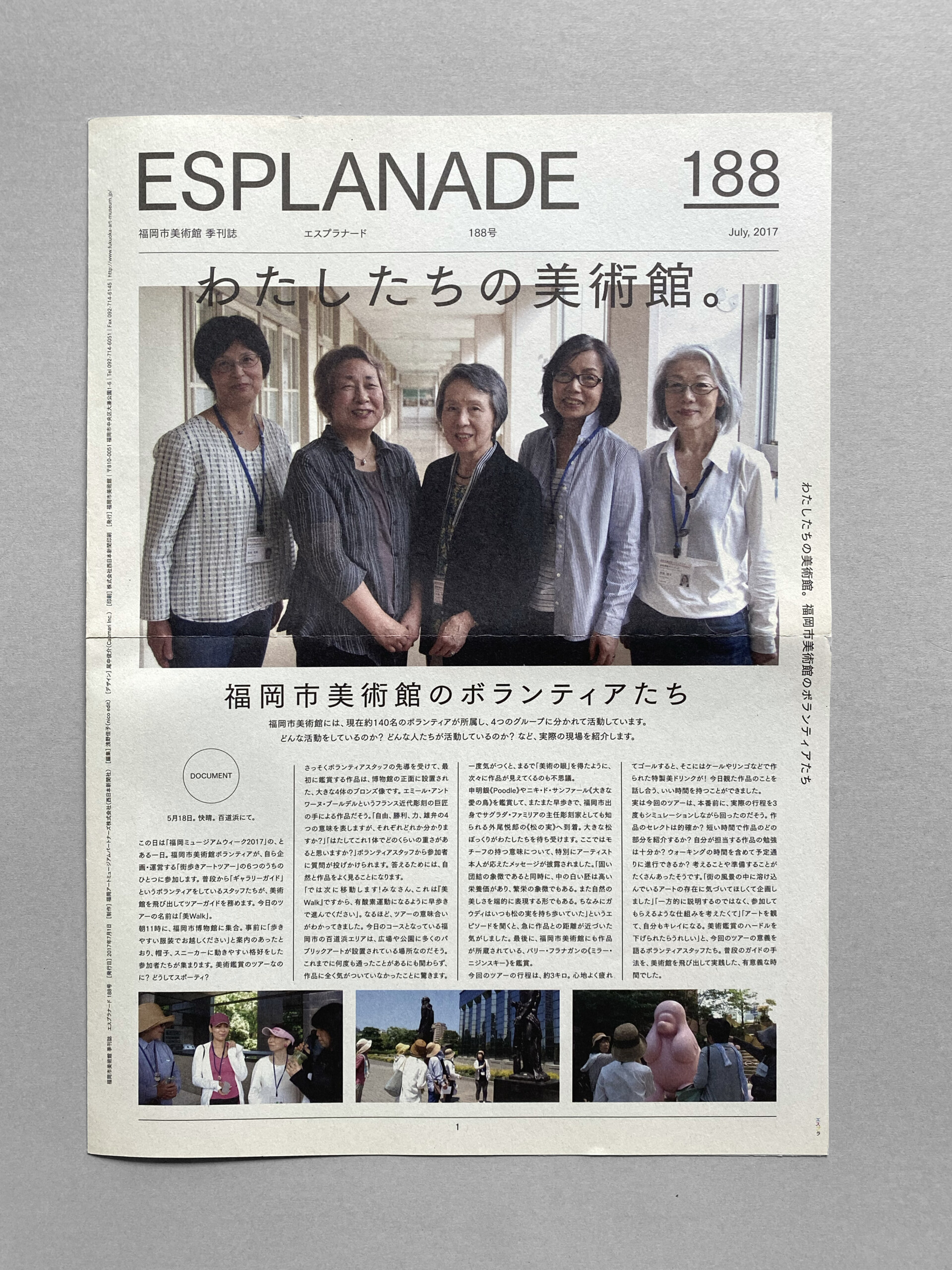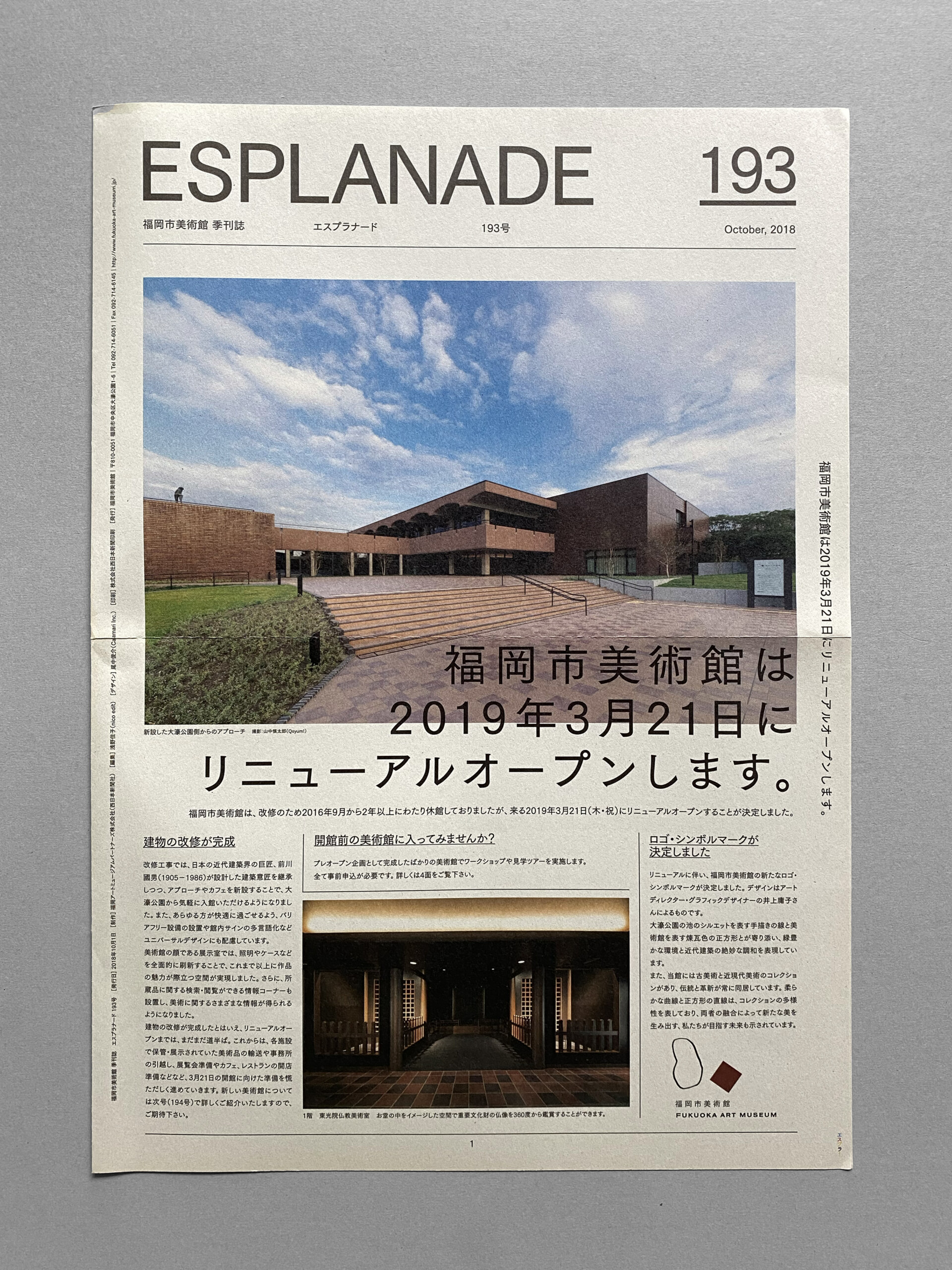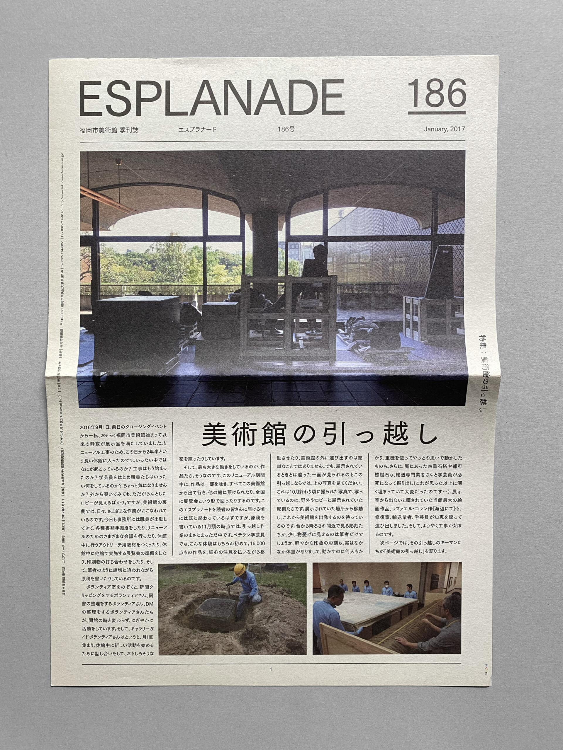 福岡市美術館がリニューアルのため休館中の時期に発行していた季刊誌。普段語られることのない美術館の裏側を毎号特集した擬似タブロイド判。フォントは、タイトルから本文、キャプションに至るまで、筑紫ゴシックPro-Dのみを使用し、下線や文字間、サイズと行間を調整することでそれぞれの役割を担わせている。