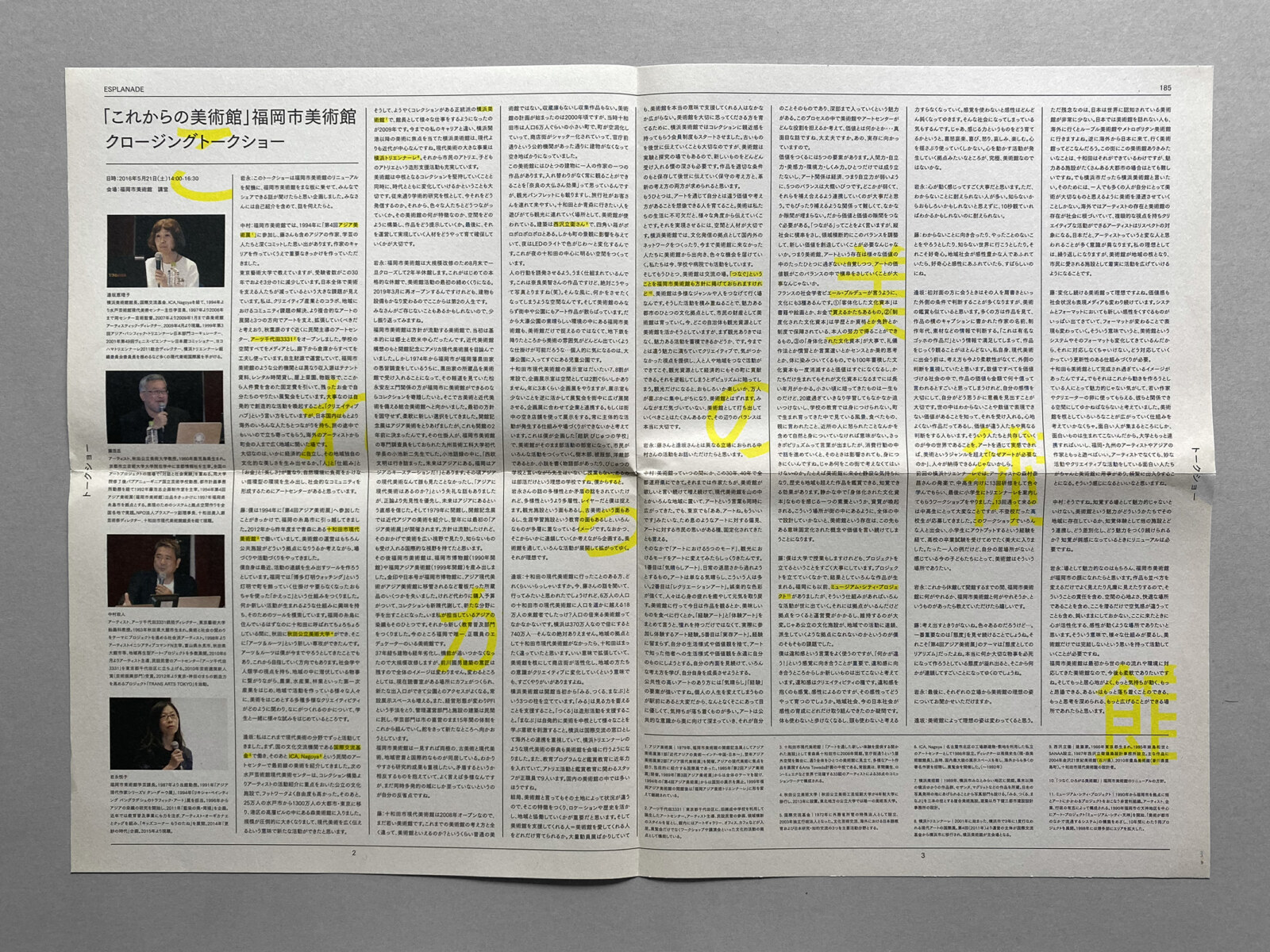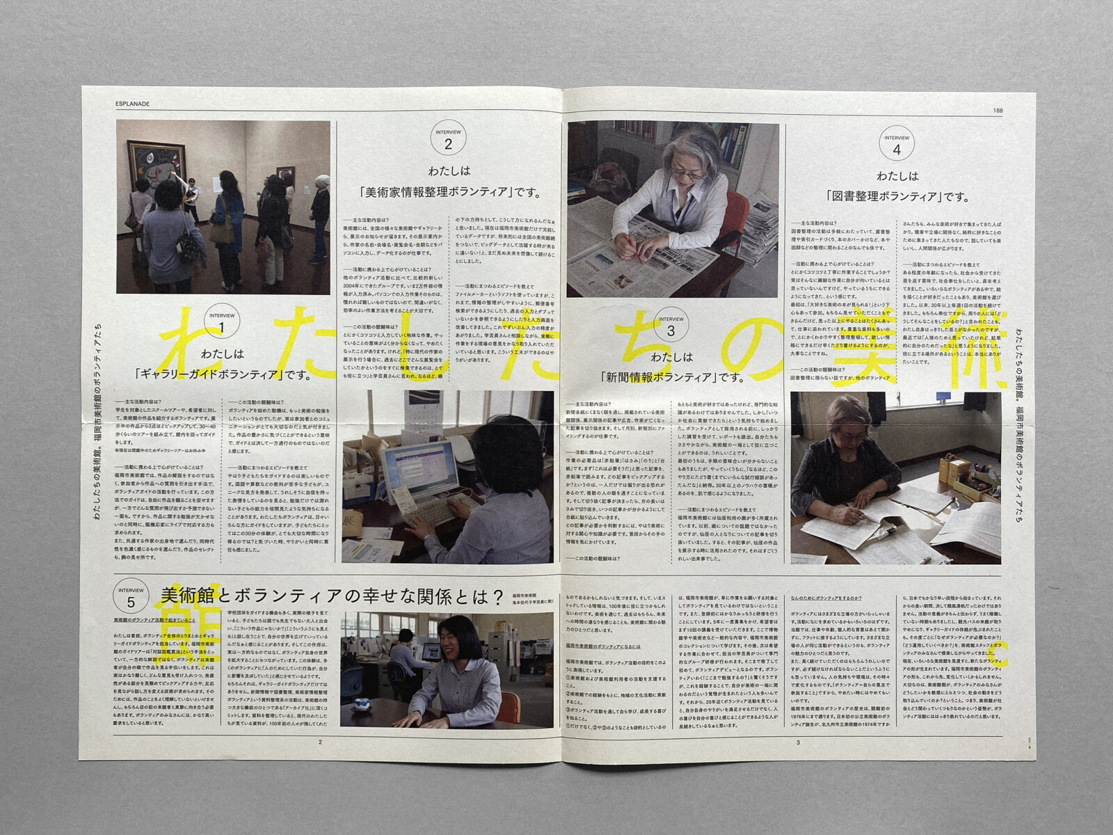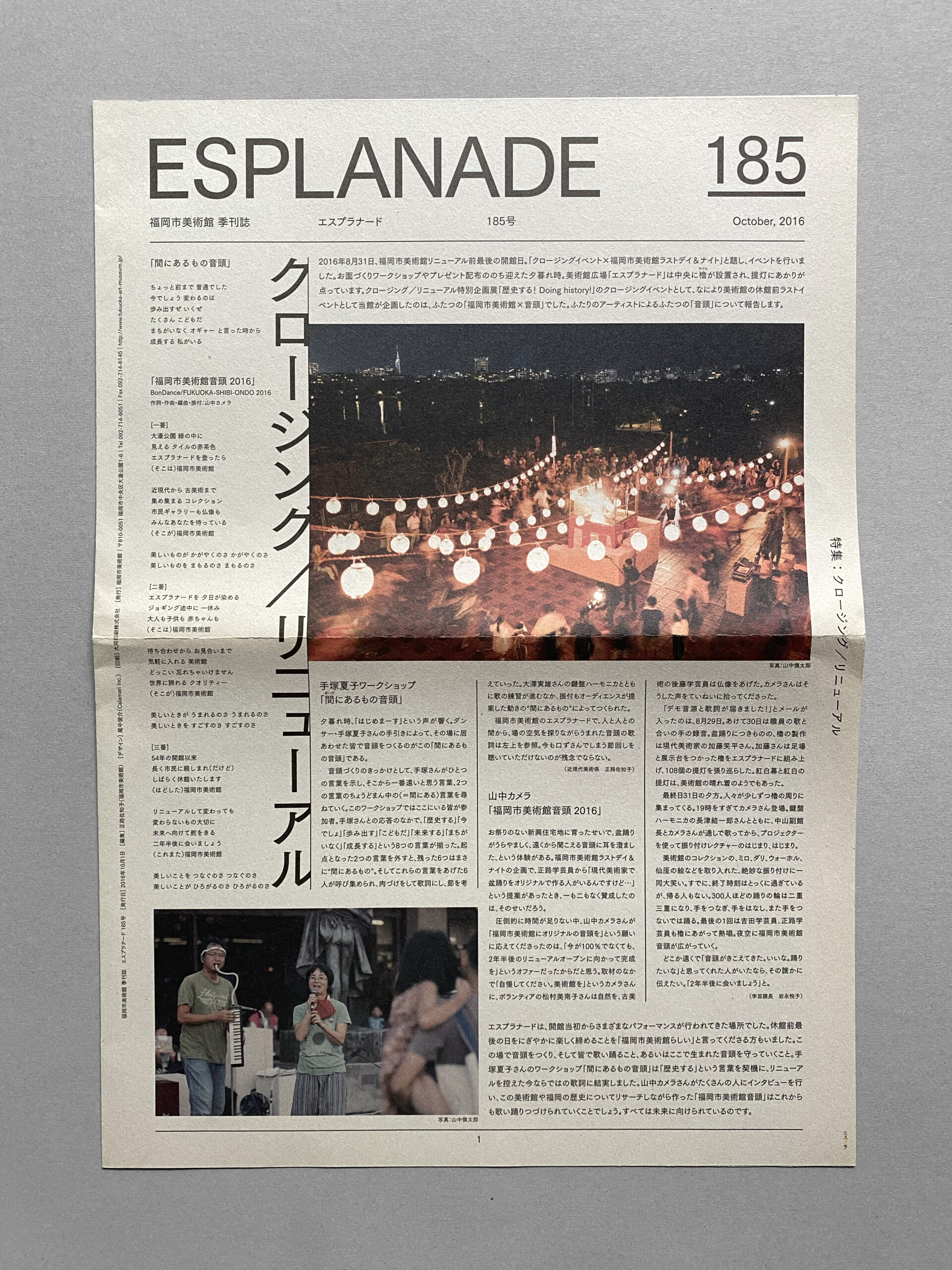 福岡市美術館がリニューアルのため休館中の時期に発行していた季刊誌。普段語られることのない美術館の裏側を毎号特集した擬似タブロイド判。フォントは、タイトルから本文、キャプションに至るまで、筑紫ゴシックPro-Dのみを使用し、下線や文字間、サイズと行間を調整することでそれぞれの役割を担わせている。