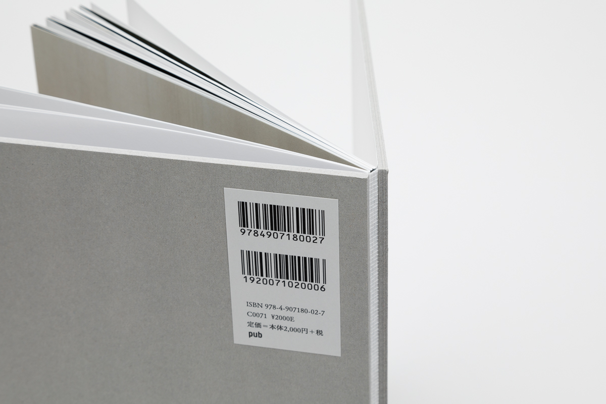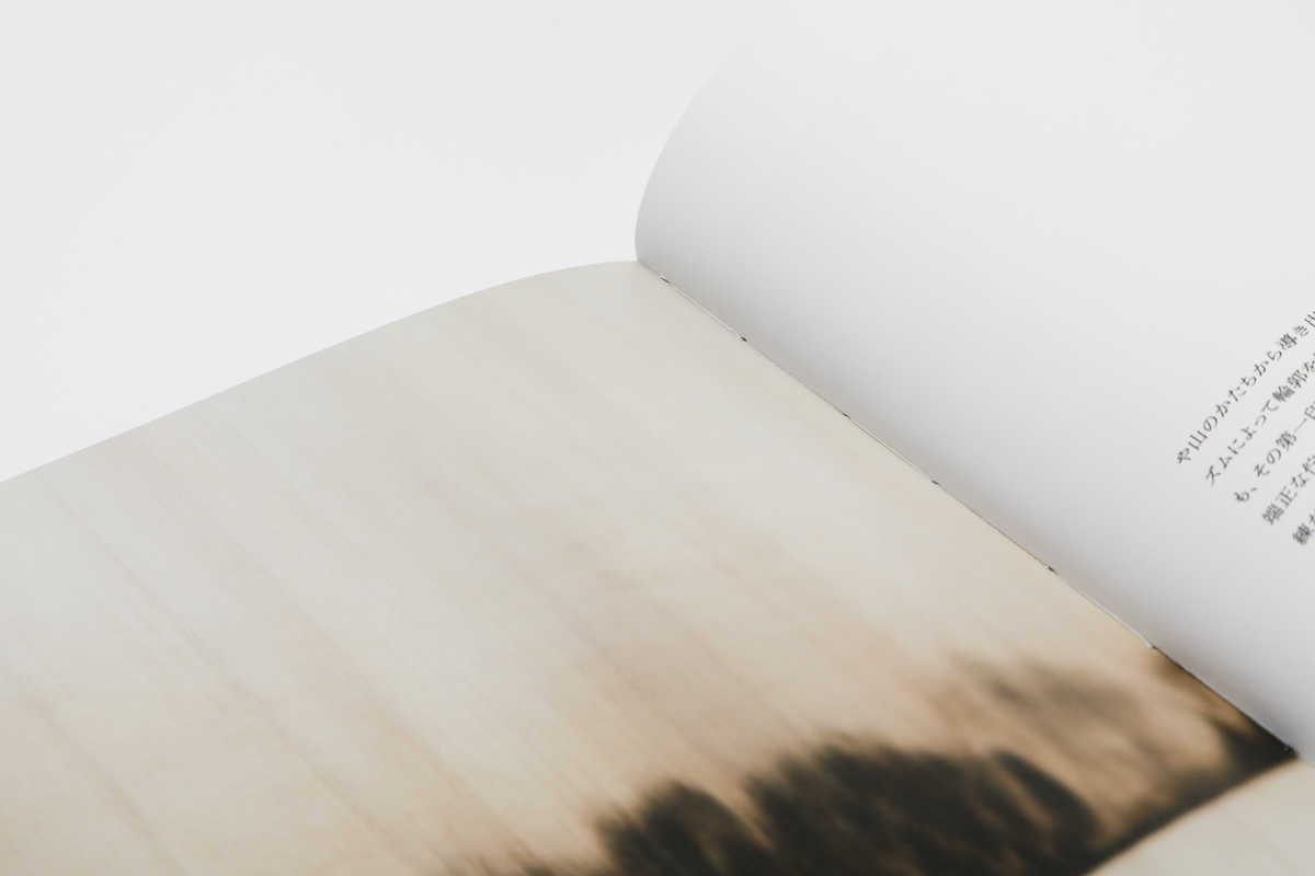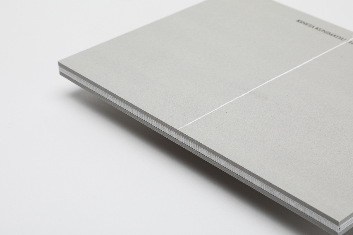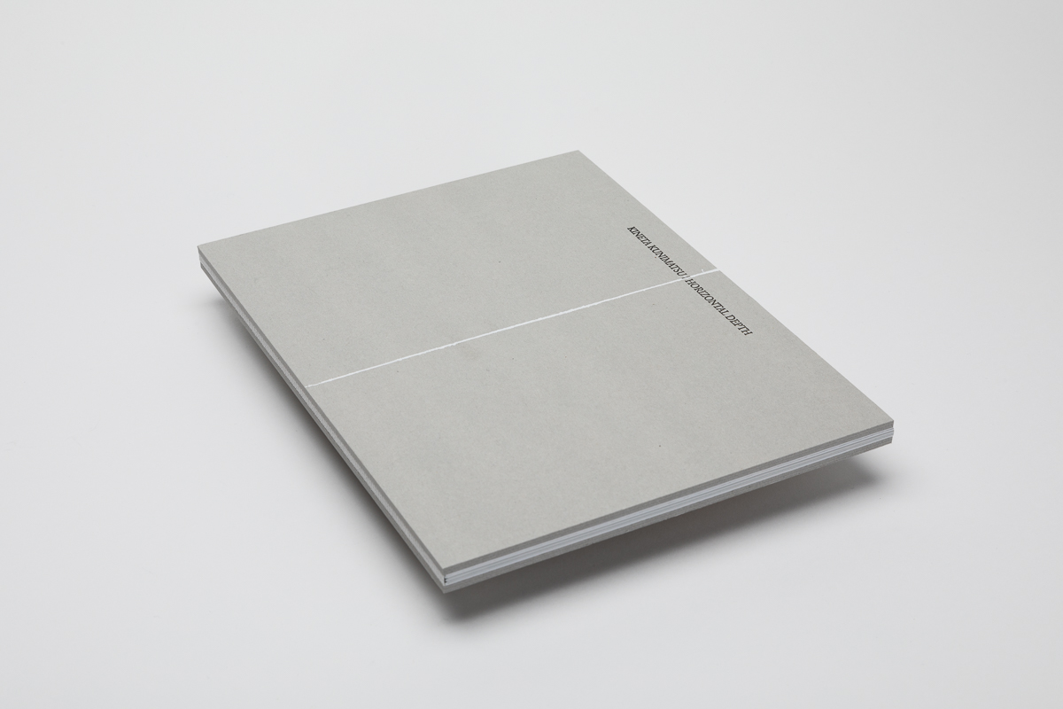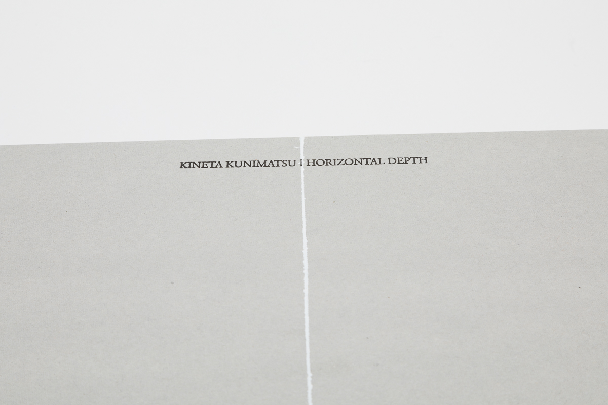 北海道白老町飛生の彫刻家・国松希根太の初めてとなる作品集。糸縢りにした本文を厚さ3.5mmのチップボールの板紙で挟み、寒冷紗で背をくるみ綴じることで、オブジェクトとしての存在感を強調させた。また、国松作品に特徴的でありタイトルにも使われている「HORIZONTAL=水平な」という言葉を象徴するように引かれた白いラインは、材木や建築現場で地墨を引くための墨壺に白の塗料を用いて彫刻家の手作業によって引かれている。本を数冊横並びにして引くためラインが一冊ずつ微妙に異なる表紙となった。同様に一冊一冊スタンプで押されたタイトルは「DEPTH=深さ」という言葉の示す通り、下方に向かって縦に組まれた。本文のテキストは頁をまたいでレイアウトすることで、連続性を分断し、リニアな時間に変化を与え、厚み(深み)を意識させるよう仕組まれた。(尾中俊介)