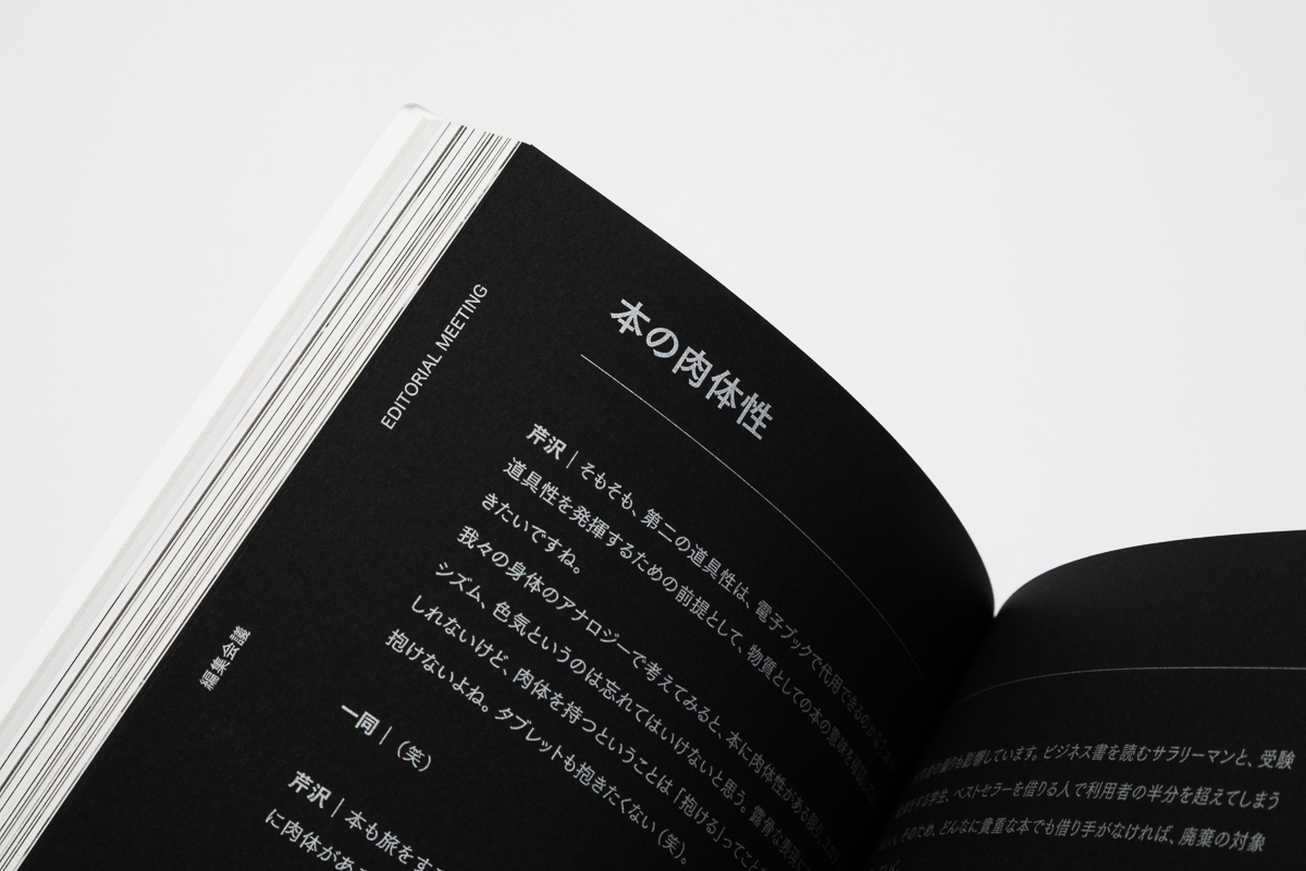 一方、ブックデザインあるいは造本設計とは、本の存在そのものを創出する。骨格、筋肉、内蔵、血液、神経系統などを整理して身体そのものを立ち上げる。本書においては、本文と頁割りが著者・編集者・デザイナー間の本気のやりとりによってリアルタイムに生成されていくため、デザイナーは本の仕様変更と見積り換算を幾度となく繰り返した。