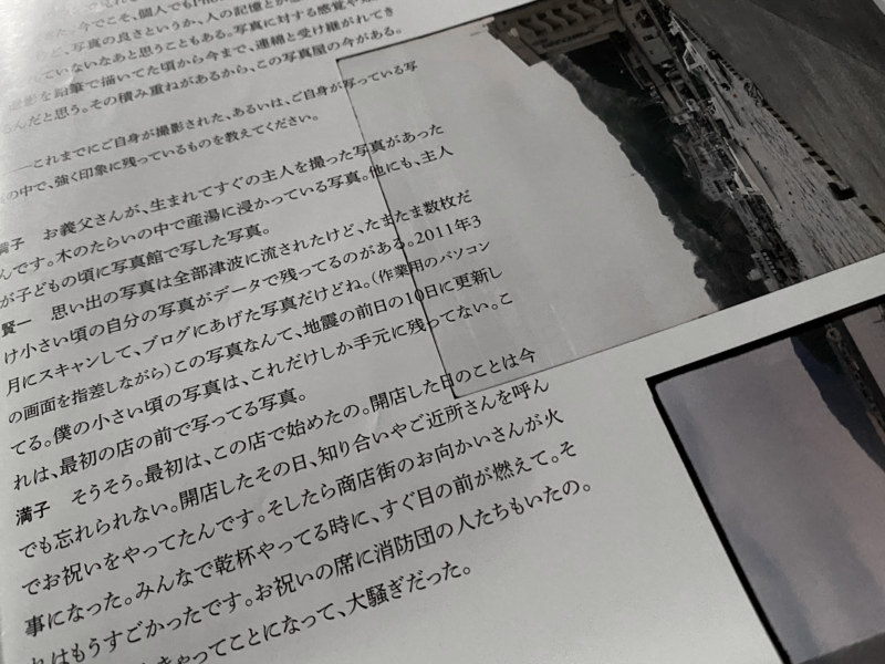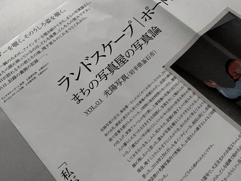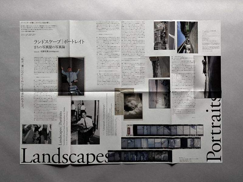 AHA!の松本篤は『はな子のいる風景』の制作過程において、人と象が写る風景写真とも肖像写真ともみえる膨大な写真群が、一般市民によって撮影されたものだけでなく、まちの写真館という職業的存在によって記録されていたことに気づく。そこで記録に残す人々の営みの「あとを追う」ことで見えてくる被写体の歴史と記録者の歴史に注目、写真館に残された記録と記憶を手掛かりに、ファインダーを覗くそのうしろ姿を、記録者たちの自画像として覗くプロジェクトを始動させた。A1判八つ折りのオモテ面には写真スタジオとポートレイトを自身によって撮影してもらいA1サイズの半分ずつに並置、中面はインタビューとプライベートな写真を並べることで、普段は注目されることのない記録者の見た風景とその姿に焦点を合わせ記録した。(尾中俊介)
