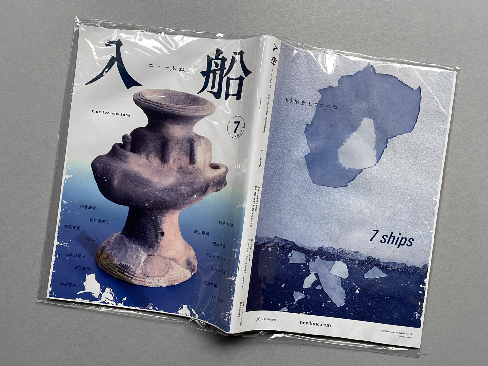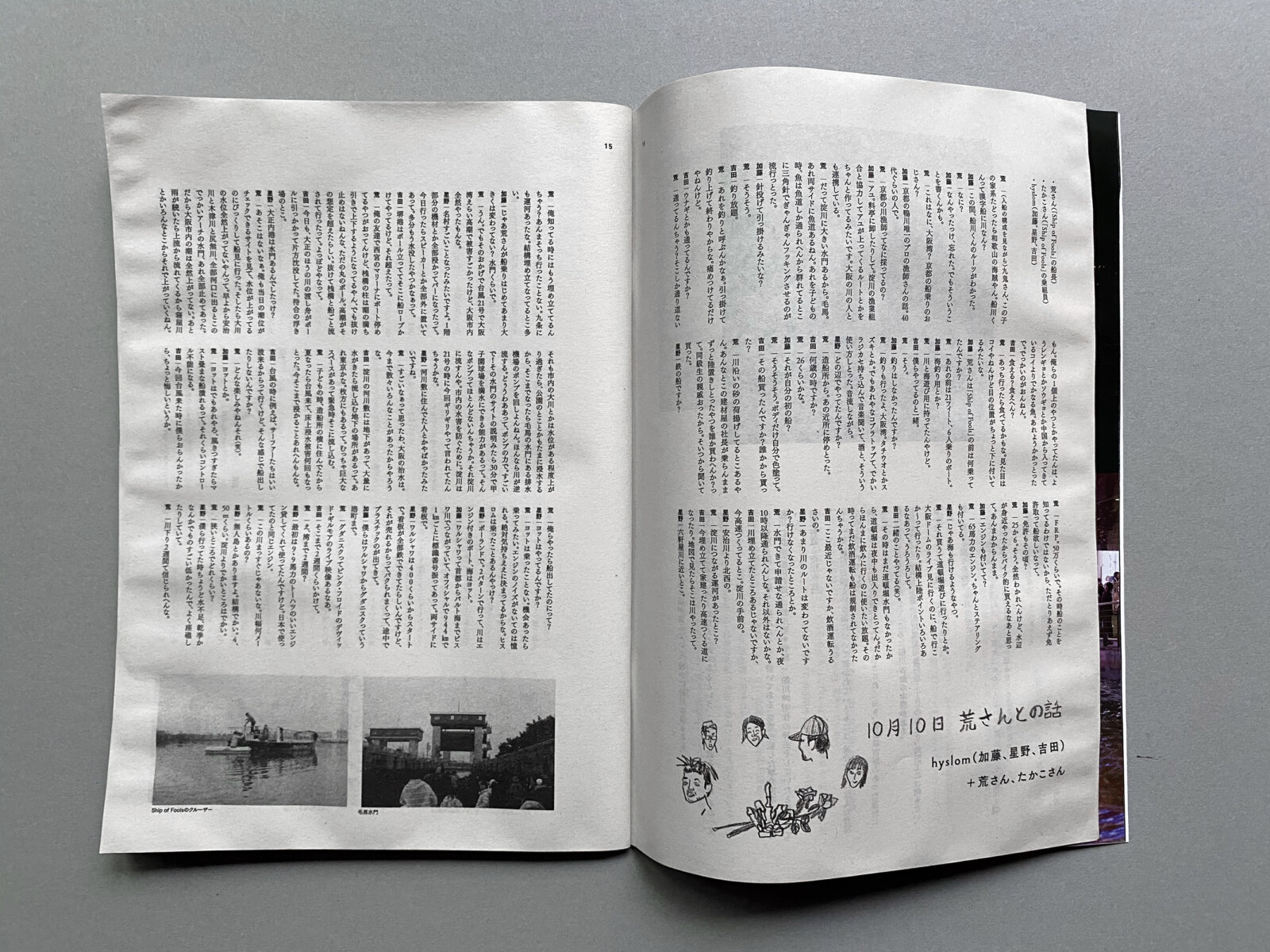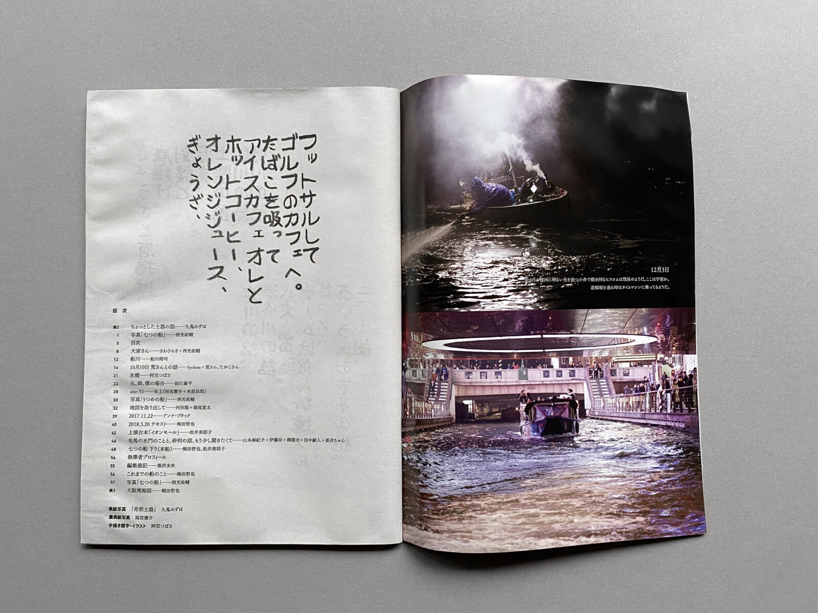 仕様|B5判|中綴じ/リソグラフ・オフセット印刷・(大阪・木津川の水を製本された本の表紙および本文に浸したのち、開いたまま乾燥させたため)折れ、縒れ、破れ、くっつきあり
