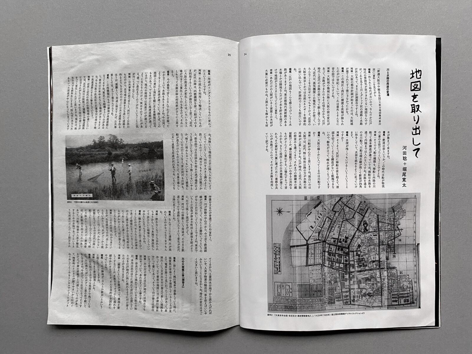 海の魚は身から、川の魚は皮から焼くといいらしい。とすれば、海水と淡水がほどよく混じり合う河口付近で揚がったこの本なら、どちらから焼くのがベストだと言えよう。ともあれ、売り方としては海岸に打ち捨てられたビニ本よろしく、開きにして平置きとするのがいいだろう。中綴じだからよく開くし、天日干しのおかげで皮もしっかり日に灼けて、赤黄がきれいにとんでいる。それとも身のほうを上にして、脂ののりきった写真を見せるほうが肥えた舌にはオツであろうか。ところで、綴じることは文字通り閉域をつくりだすことで、いったん閉じられたフォームを自前の包丁で開くのはいつだって読者の役割であった。とはいえ最近では、鱗を取り、ハラワタを捌き、あらかじめ二、三枚におろした加工品がスーパーでは主流なのだから、本が開かれて売られていてもそれほどおかしなことではないだろう。ただ、身から焼こうが、皮から焼こうが、そういう美学に関しては、アジにうるさい読者に一任したい。(本文より・尾中俊介)