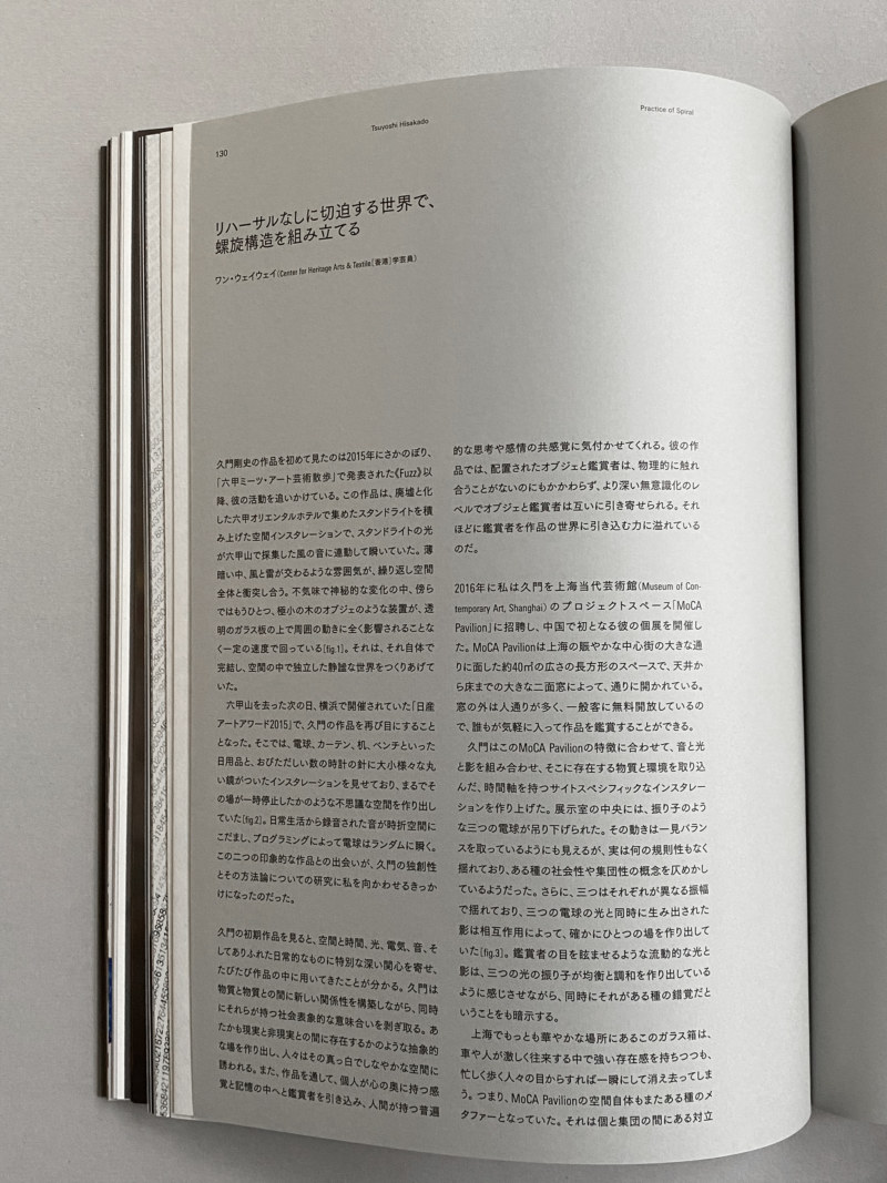 初の作品集となるこの展覧会図録では、来田猛がインスタレーションを撮り下ろした写真によって全編構成。いわゆる展覧会の記録写真とは一線を画し、各部屋の雰囲気や気配までもが丁寧にとらえられています。本書では、展示室の部屋ごとに扉で区切り、そこでは使う紙や印刷までも、作品テーマや空間に呼応させています。「できるだけ作品を見る人々に空白を渡したい」と久門が記すように、シンプルな構成ながらも、マテリアルによる質感の変化や、ページをめくる動きまで、細かな造作にもこだわったビジュアルブックとして、尾中俊介(Calamari Inc.)がまとめ上げました。社会が混沌としている状況の中でも、物事を美しいと思える態度を揺るぎなく示し続けてきた久門剛史の芸術世界をぜひ体験してみてください。(torch press HPより抜粋)