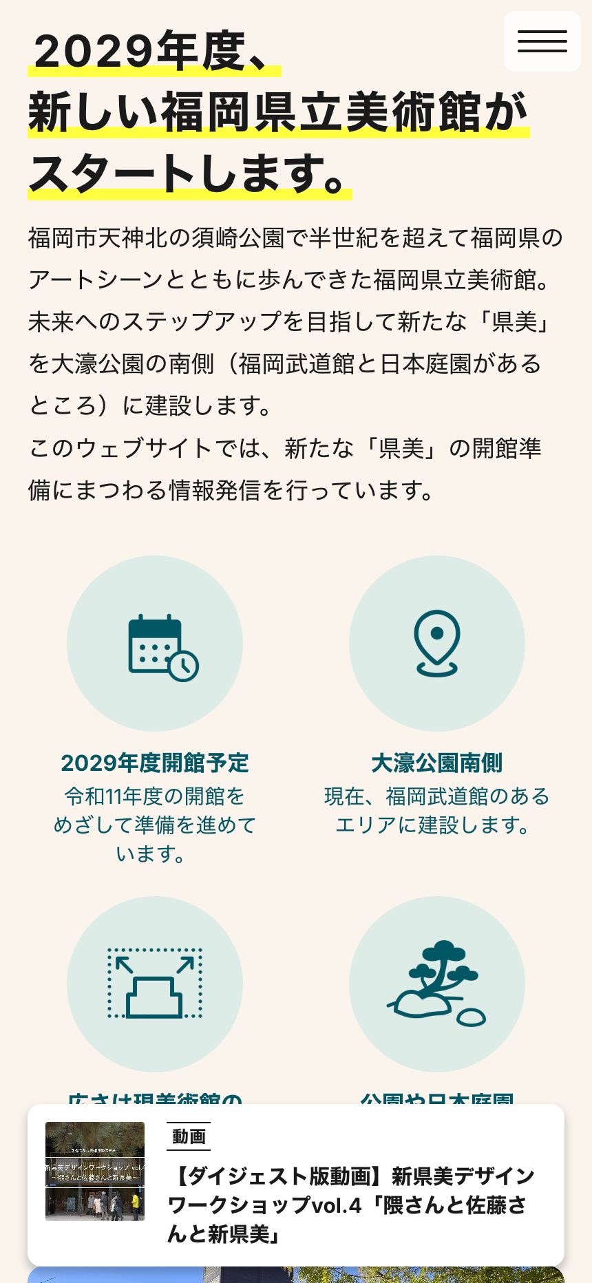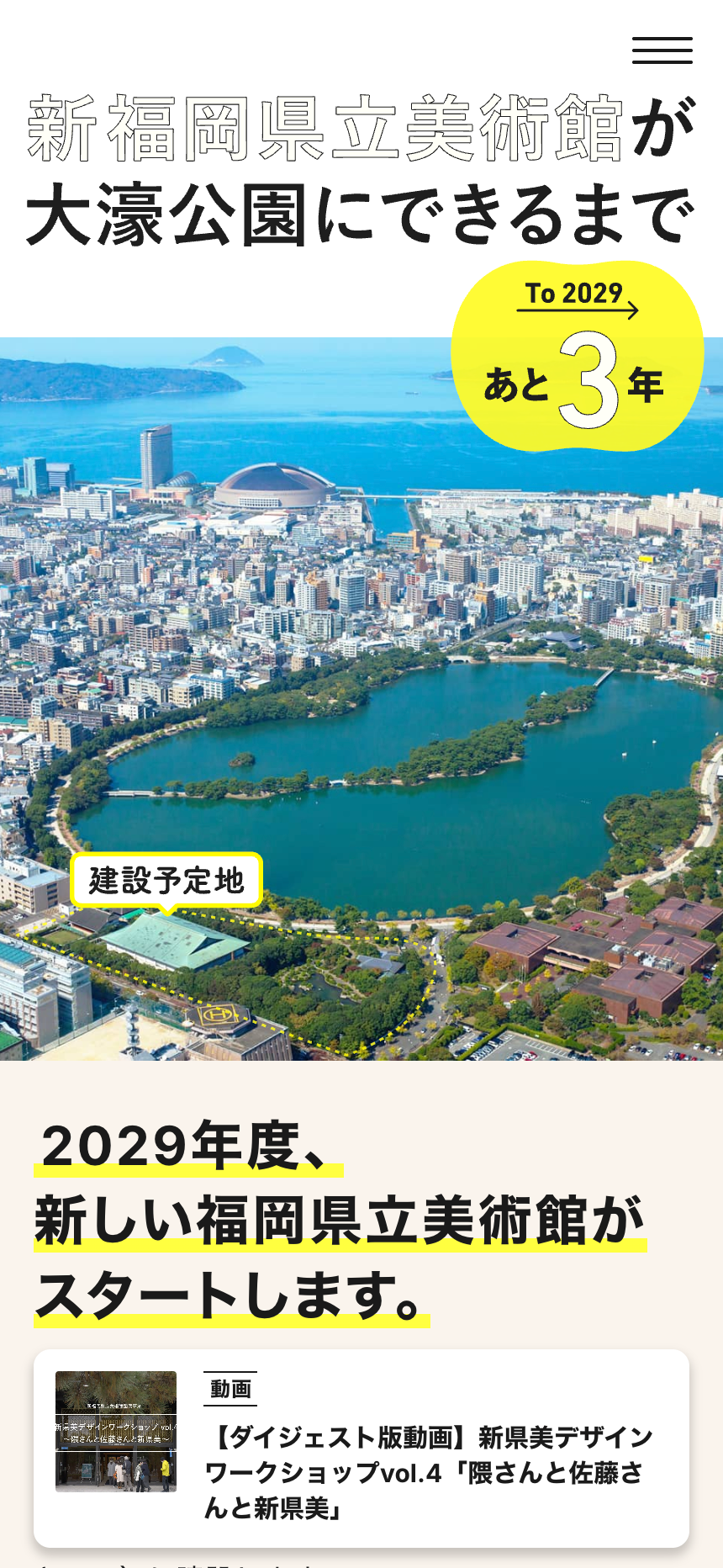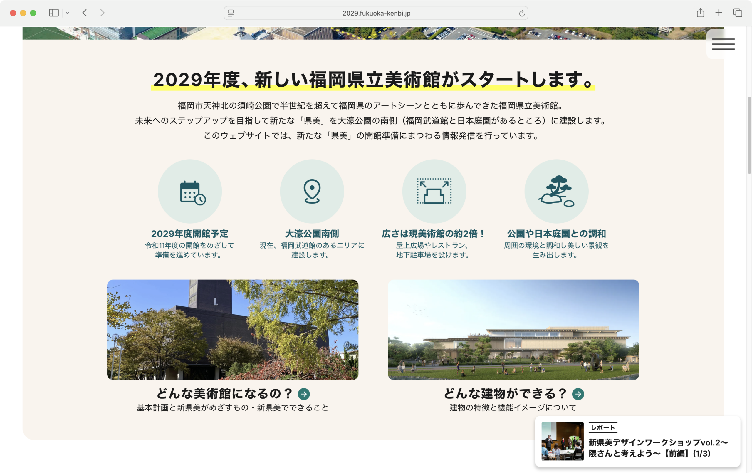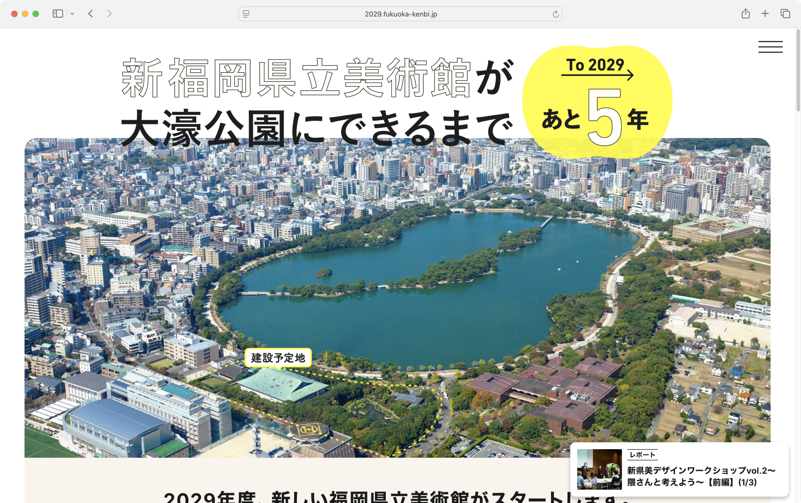 新福岡県立美術館が大濠公園にできるまで特設サイトhttps://2029.fukuoka-kenbi.jp/–サイトデザイン・構築|田中慶二(Calamari Inc.)